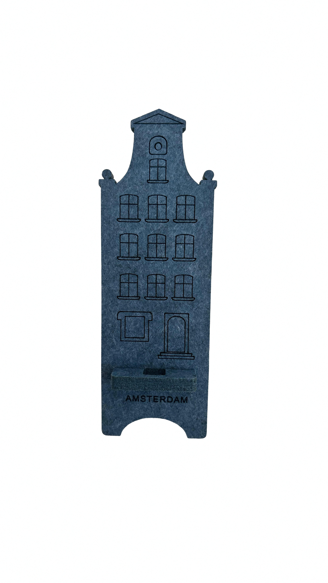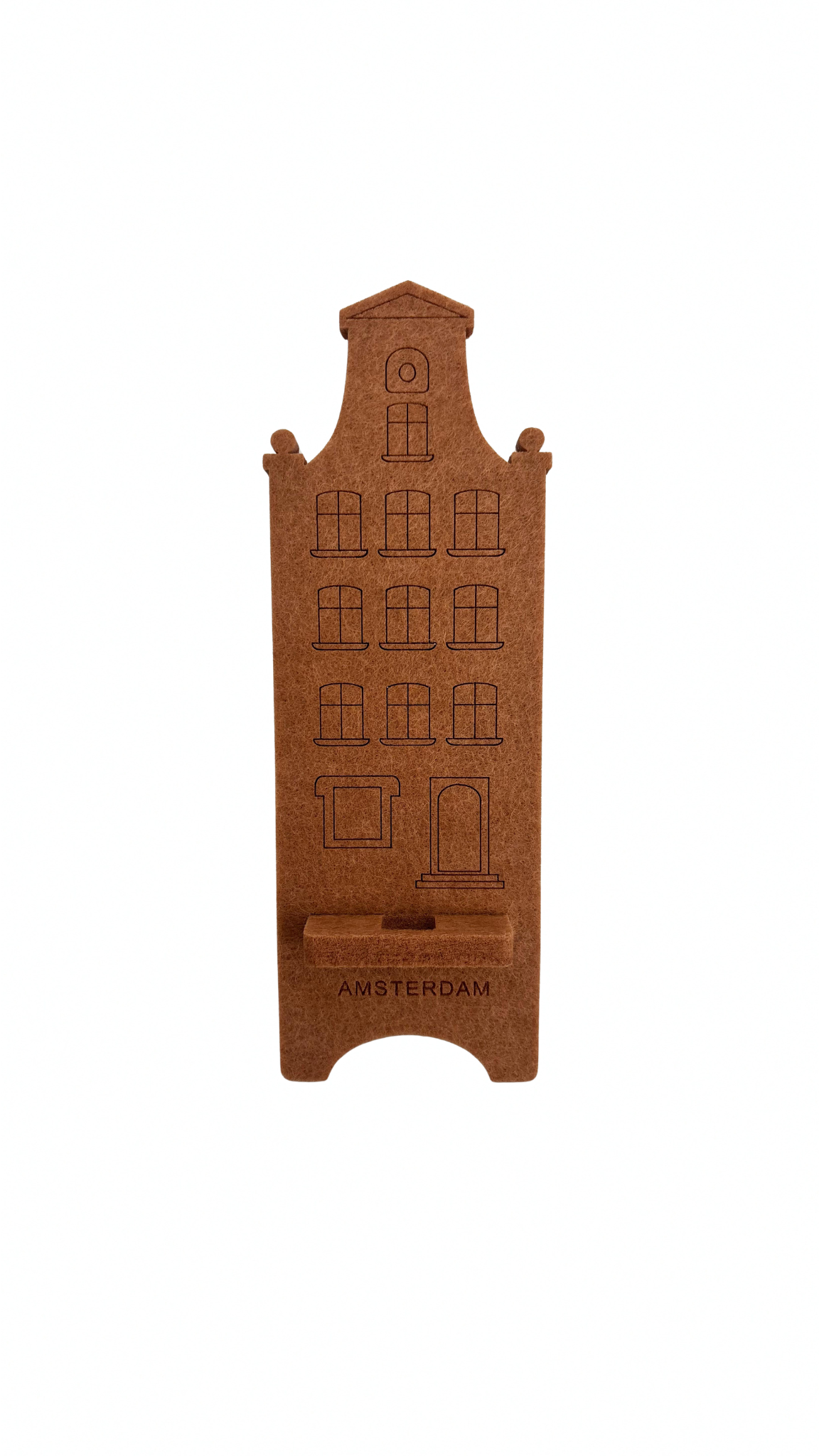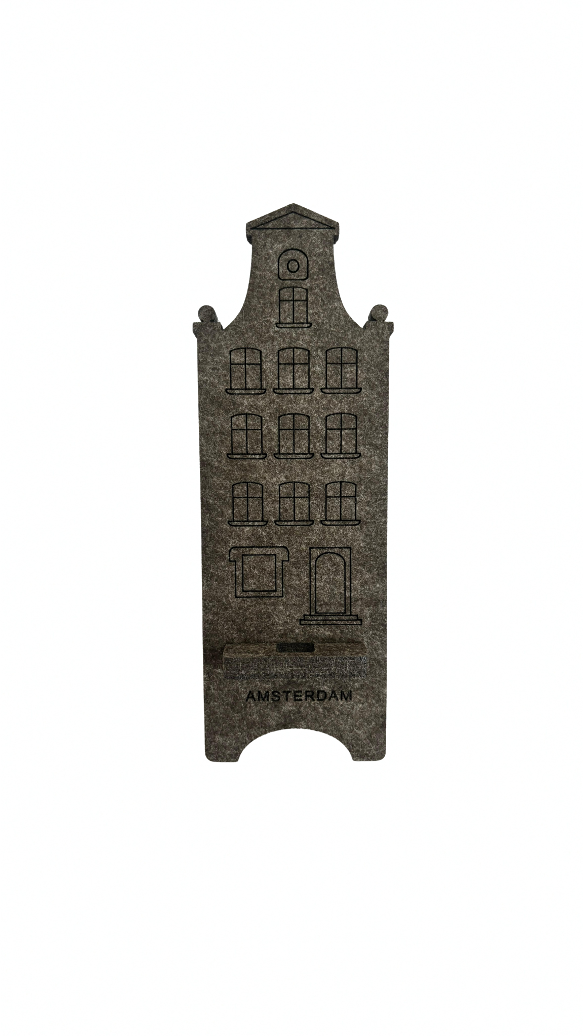 These phone stands are a functional, stylish, and sustainable addition to any desk, nightstand, or simply on the table. The phone stands are shaped like a typical Amsterdam canal house with Klokgevel (Bell Gable) roof.
