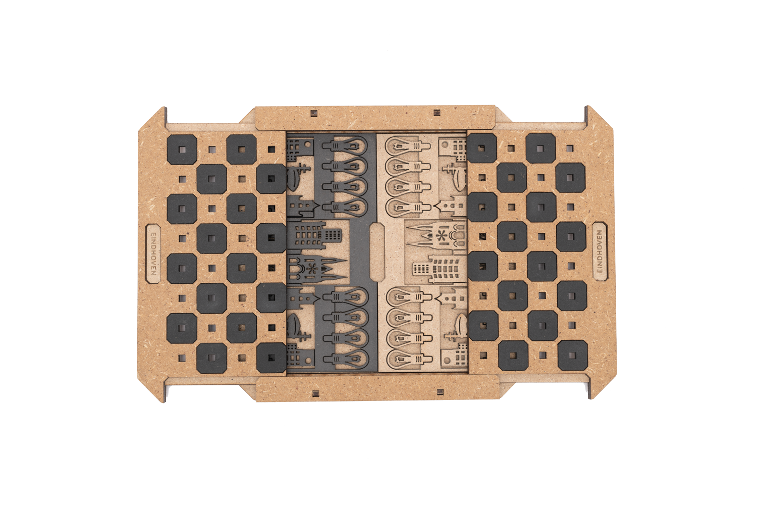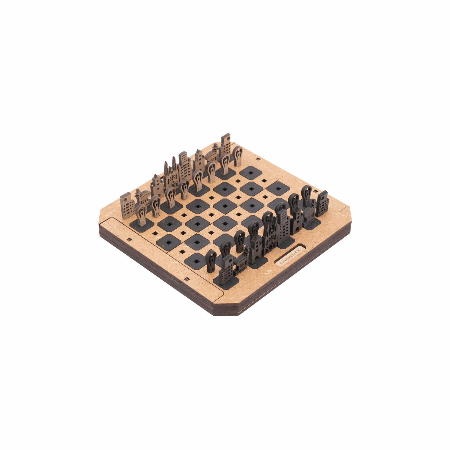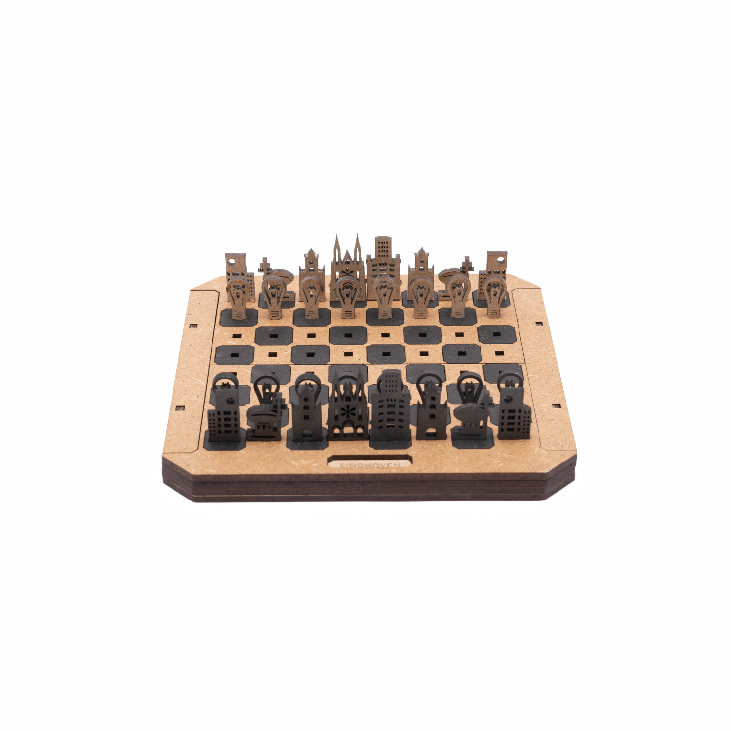 The Eindhoven City Chess Set features pieces inspired by iconic landmarks like the St. Catharinakerk and the Evoluon, celebrating the city's innovative heritage. Its compact board includes built-in storage, making it ideal for travel or display. Crafted from premium materials, it’s a unique keepsake for chess and Eindhoven enthusiasts alike.